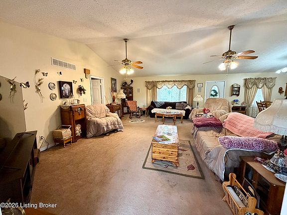Don't miss your chance to own this GREAT property! Large covered front porch greets you as you enter into the comfortable two-bedroom two bath vinyl sided ranch with metal roof & 6 car detached garage situated on an acre lot in Shepherdsville, Ky. Home offers 1632 sq. ft. of spacious & comfortable living space with open floor plan, vaulted ceilings, along with large Kitchen with island bar. Bedrooms are housed on opposite sides of the home allowing for the utmost in privacy, both with access to their own deck. Lovely sunroom offers beautiful views. Plenty of parking & 24x60 garage w/ vaulted 32x36 garage added. All conveniently located minutes from I65 in Bullitt County. Let's take a look today!