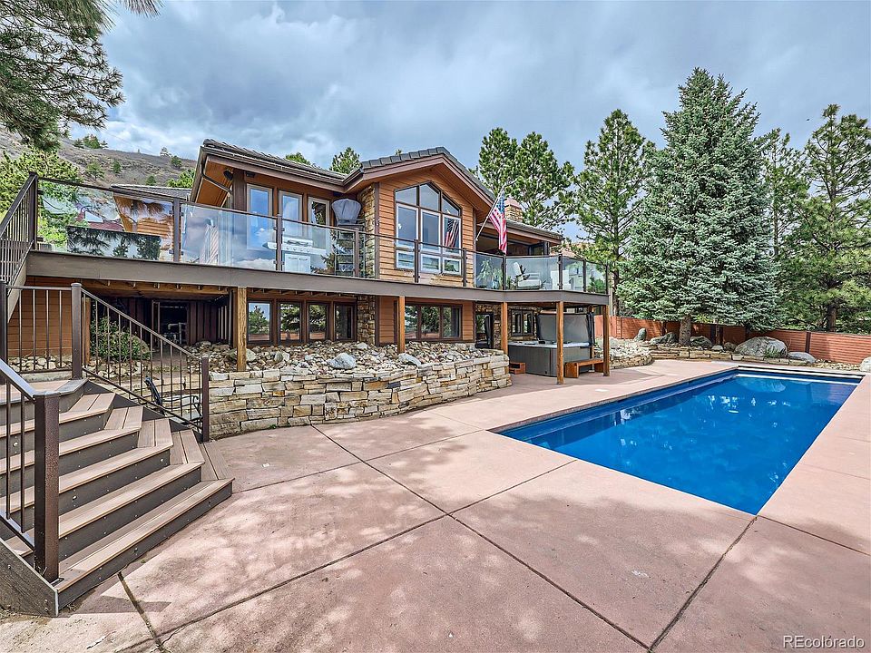 Welcome to your secluded sanctuary nestled within the majestic Roxborough Park! This single-family abode exudes elegance and charm with its vaulted ceilings, luminous interiors, and seamless open layout. Enter to discover a world of refinement as rich hardwood floors guide you through each sunlit space. The kitchen, a culinary haven adorned with granite countertops, invites culinary exploration with its soft-close cabinets and gourmet gas stove. Adjacent, the dining area and living room, beckoning with the warmth of a wood burning fireplace, invite you through folding doors to a wraparound deck, offering panoramic views of rugged mountains and a private pool oasis below. On the main floor, the primary suite awaits, a haven of tranquility boasting an expansive 5-piece bath illuminated by a skylight. An office space and powder room complete this level, ensuring convenience and comfort at every turn. Descending to the lower level, discover three additional bedrooms and a sumptuous 3/4 bath featuring double vanities. The vast walk-out basement, resplendent with fresh paint and plush carpeting, opens seamlessly to the backyard that offers instant relaxation and enjoyment. With a pool and jacuzzi, every day feels like a vacation! Whether you're splashing around with the family, hosting epic pool parties, or simply soaking up the sun on a lounge chair, your backyard oasis is the ultimate destination for fun and rejuvenation. Perched majestically within the foothills of the Rocky Mountains, Roxborough Park boasts towering red rock formations that create a dramatic backdrop against the azure skies. Residents are treated to sweeping vistas of verdant valleys, sparkling lakes, and rugged peaks, all within easy reach of their doorstep. Roxborough Park provides an array of amenities and recreational opportunities for its residents to enjoy. From hiking and biking trails that wind through pristine wilderness areas to world-class golf courses. *new AC, Furnace, and exterior paint*