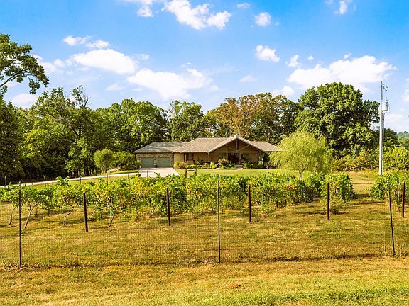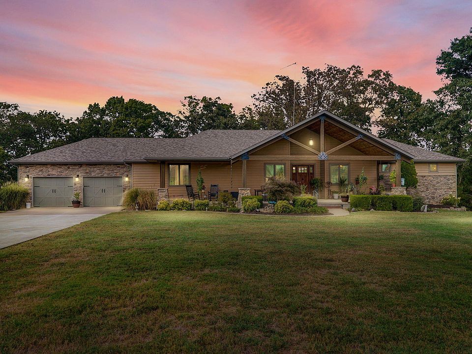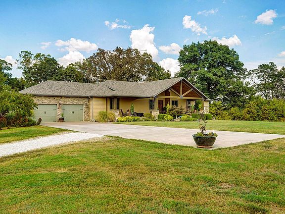 Welcome to Your Private Retreat Near Fellows Lake and minutes from Springfield. Tucked away on 10 acres at the end of a long private drive, this custom-built 5,500 sq. ft. home blends luxury with country charm. Designed with energy efficiency in mind, it features full foam insulation, 5 bedrooms (all with walk-in closets), 3 bathrooms, and a front office that can serve as a 6th bedroom.The main level showcases a vaulted living room with a stone fireplace and insert, a gourmet kitchen with new double refrigerator, granite island, custom hickory cabinetry, and a large butler's pantry. The oversized primary suite offers a spa-like bath with soaking tub, walk-in shower, dual closets, private deck access, and sweeping views.Enjoy seamless indoor-outdoor living with a screened porch, expansive maintenance-free TimberTech decks, and patios overlooking an 1,800-gallon koi pond, water gardens, and wooded bluff. A remote collar-activated pet door and dog run with outdoor camera make life easier for pet owners allowing you to check on your pets throughout the day!.The walkout lower level offers 9-foot ceilings, a second fireplace, wine/rec room, and generous storage. Outdoors you'll find fenced raised garden beds, a producing 1/2-acre Chardonel vineyard, orchard, berry patch, greenhouse, shop, and even a heated outdoor shower. Deer and turkey are regular visitors.With a new roof, Anderson windows, TimberTech decking, Hardie fiber concrete siding and a whole-house backup generator, this estate is built for comfort, efficiency, and peace of mind. Home heating is versatile with propane or the wood boiler system. A rare opportunity to own a private 1 owner estate where every detail has been carefully crafted.