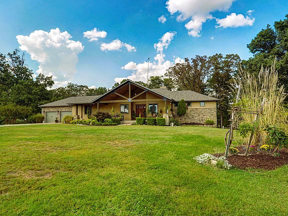 Morning coffee on a quiet deck. Sunset over the bluff. Deer moving through the trees while the koi pond ripples below. This is the kind of property people say they hope to find 'one day.' Here, it's real -- and it's move-in ready.Set on 10 secluded acres at the end of a long private drive, this one-owner, custom-built 5,500 sq. ft. estate blends comfort, craftsmanship, and privacy just minutes from Springfield and Fellows Lake. Designed with energy efficiency in mind, it features full foam insulation, 5 bedrooms (each with walk-in closets), 3 bathrooms, and a front office that can also serve as a 6th bedroom.The main level centers around a vaulted living room with a stone fireplace and insert, opening to a gourmet kitchen with new double refrigerator, granite island, custom hickory cabinetry, and a large butler's pantry. The oversized primary suite offers two walk-in closets, a soaking tub, walk-in shower, and private deck access with sweeping views.Indoor and outdoor living connect seamlessly through a screened porch, massive maintenance-free TimberTech decks, and patios overlooking an 1,800-gallon koi pond, water features, and wooded bluff. A remote collar-activated pet door and dog run with outdoor camera allow you to check on pets anytime.The walkout lower level features 9-foot ceilings, a second fireplace, wine/rec room, and generous storage. Outside, you'll find fenced raised garden beds, a producing 1/2-acre Chardonel vineyard, orchard, berry patch, greenhouse, shop, and even a heated outdoor shower. Wildlife visits daily.Recent upgrades include a new roof, Anderson windows, TimberTech decking, Hardie fiber-cement siding, and a whole-house backup generator. Heating flexibility includes propane or the optional exterior wood heating system.A rare opportunity to own a thoughtfully crafted, private estate where every detail has been designed for beauty, comfort, and long-term enjoyment.