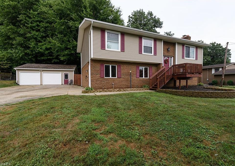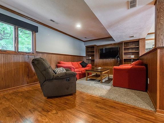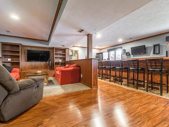 This is an entertainers dream!! Extra long and wide concrete drive with an oversized two car garage. Enter the family room with a 12 foot custom built bar and built in entertainment area. Outfitted with surround sound, crown molding, and recessed lighting. There is another nook area with a full wall brick fireplace with a custom mantle, and an office with unreal custom cabinets and shelving. The office has sliders to a private patio and a full bath with tile floors and surround. The front entrance has its own deck and opens to a 1.5 story entrance lit by the etched glass sidelights. There is a new laminate wood floor and a seating area to remove shoes. The living room and dining room are accessible to the updated kitchen with its tile floors, tile backsplash, new countertops and stainless steel appliances. The dining room has double doors that open to an enormous deck that overlooks the tree lined backyard with fire pit, and 6 foot privacy fence. The master has a double closet with closet system, ceiling fan, crown molding, and opens to a full bath with double sinks, wainscoting, and a jetted tub! The additional bedrooms both have double closets. Everything has been updated!!
