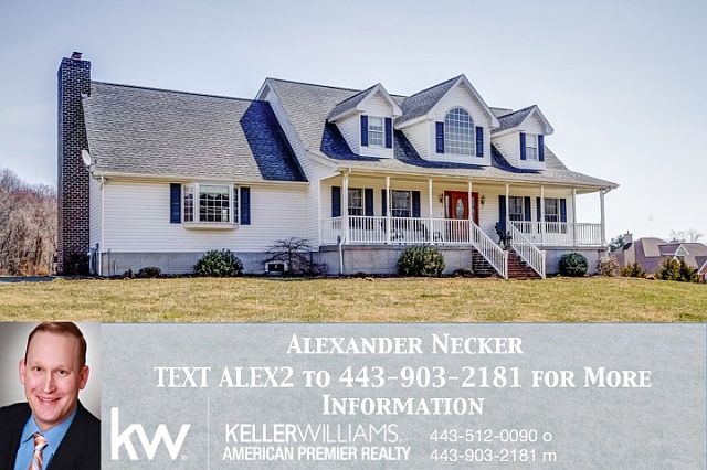 Text ALEX4 to (443) 903-2181 for more an instant video tour. Built on a level lot of 4 acres this custom home has all the convenience of one floor living plus room for a family upstairs. Built in 2006, the first floor entry soars 2.5 stories, making an impressive statement. The home office/study can easily accommodate those who need a private area for working at home. The gigantic kitchen has miles of counter space, a center island with seating for 2, a trash compactor, 2 pantries and a built-in microwave/convection oven combination, as well as a large dining area. The huge Great Room has a built-in bar, fireplace, bow window and two exits to the 80 x16 foot deck. Double doors swing open to the first floor master suite. Hardwood floors throughout the first floor and plenty of light create a unified look. Hardwood steps lead to the second floor with 2 bedrooms and a full bath. Solid oak doors and trim throughout the house give this home a custom look. The basement has a full bath, laundry room and a 70-foot long storage closet with built-in shelving. The remaining area is perfect for a business office, in-law suite, exercise room, home theater, and man-cave or crafting studio. This home borders a golf course but is only 4 minutes from 95, 10 minutes to APG and convenient shopping in Aberdeen. To see "WHAT THE SELLER SAYS" visit 649AldinoStepney.com