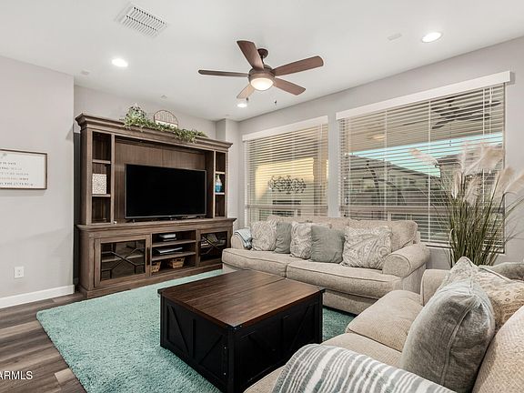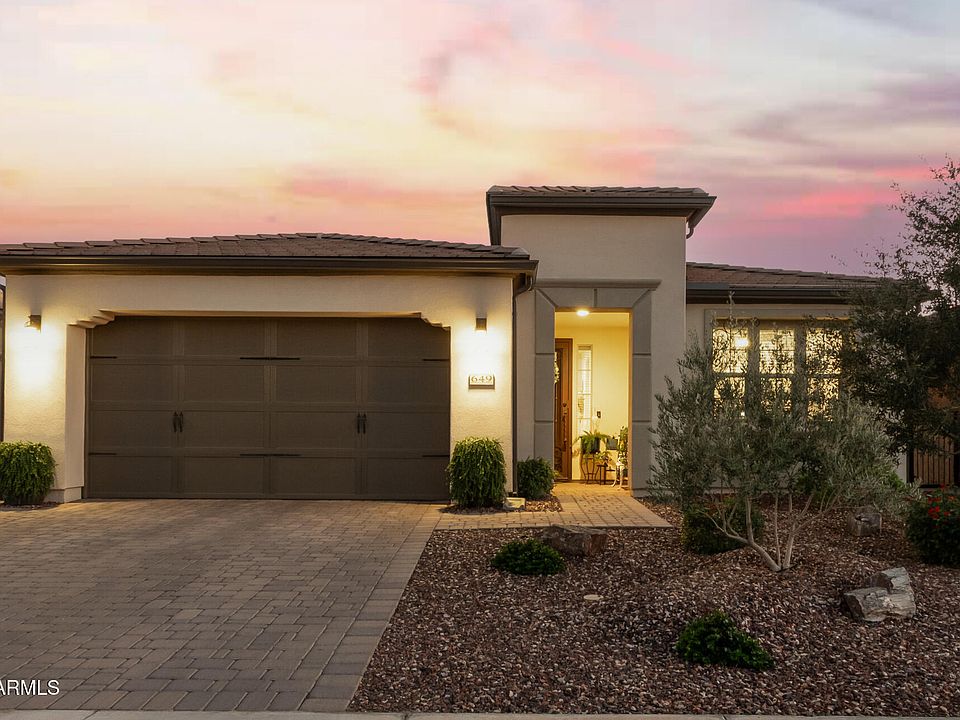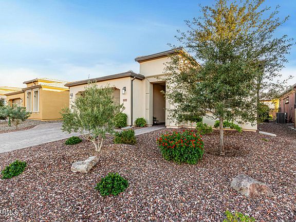 Your dream home is here! This lovely 2-bed residence welcomes you with tasteful pavers, and a thoughtfully designed front yard. Discover a stunning great room with high ceilings, recessed lighting, a soothing palette, blinds, and attractive wood-look flooring. The impeccable kitchen features granite counters, crisp white cabinets with crown moulding, chic pendant lighting, SS appliances, a pantry, and an island with a breakfast bar. The primary bedroom showcases an ensuite with dual sinks and a walk-in closet. Enjoy enchanting sunsets in the backyard, which includes a covered patio for dining al fresco. The Community boasts serene lake views, lush greenbelts, a recreation center, breathtaking mountain views, a refreshing pool, golf courses, and more! Make this gem yours!