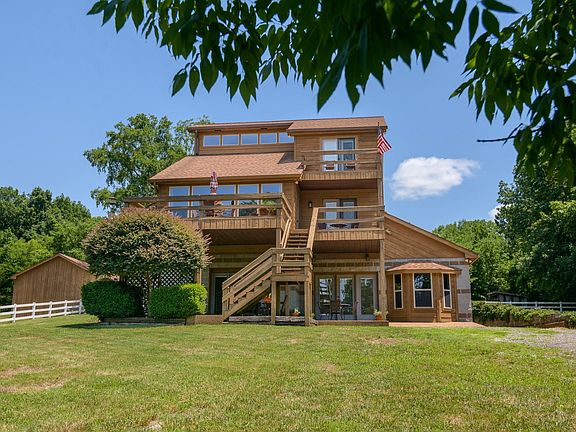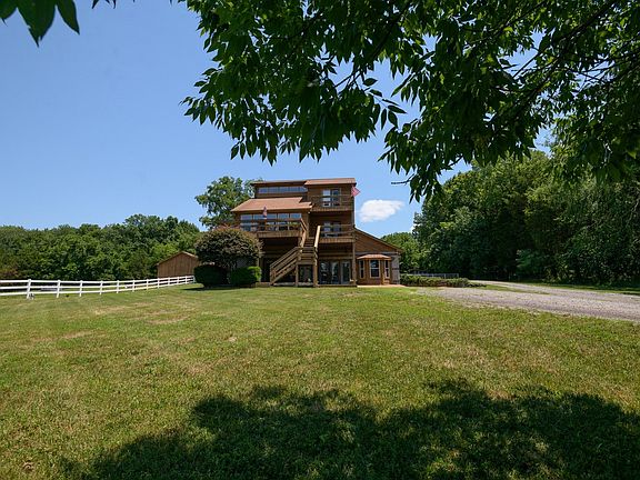 Gorgeous Contemporary Style home located on 5 private acres. Western Cedar siding, spacious floor plan w/plenty of natural lighting. Living room on second floor w/gas fireplace & hardwood flooring. Kitchen with Stainless Steel appliances, granite counters, tile backsplash, breakfast bar & island. 30x19 den on main floor w/wet bar & 14x13 bonus room on third floor. Beautiful sunroom joins kitchen area, safe room on main level, gorgeous views of property from multiple decks and patio. 2 car covered carport. Property consist of mainly rolling pasture, fenced and cross fenced, Two stall barn with 32 x12 tack room, electricity, water, half bath & RV hookup. Separate Implement shed for tractor storage.