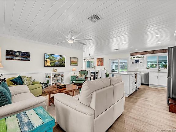 Charming Ocean Access home on the North Fork of the St. Lucie River! Check out this remodeled 3 bed/2bath/ 1 car carport attached pool home in Port Saint Lucie with a view overlooking a wide turning Basin and canal! Great home if you're looking for your fulltime residence or weekend getaway home. Home was remodeled in 2022 with new flooring, new kitchen cabinets including new quartz countertops, SS Appliances, a chef's island, white PTG tongue and groove ceilings. Tankless hot water heater installed as well as new AC in 2022. Saltwater pool was just resurfaced before going to market. Separate shed for storage. Private dock with water/electric as well as a 10k lb. boat lift. Looking to cruise the quiet North Fork of the St Lucie River or head to the ocean this home offers it all.