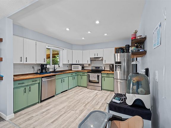 Inlaw suiteAttached drive-thru garageStunning open flow feelStainless steel kitchen appliancesButcher block countertopsTiered solid wood deckWell manicured lawn