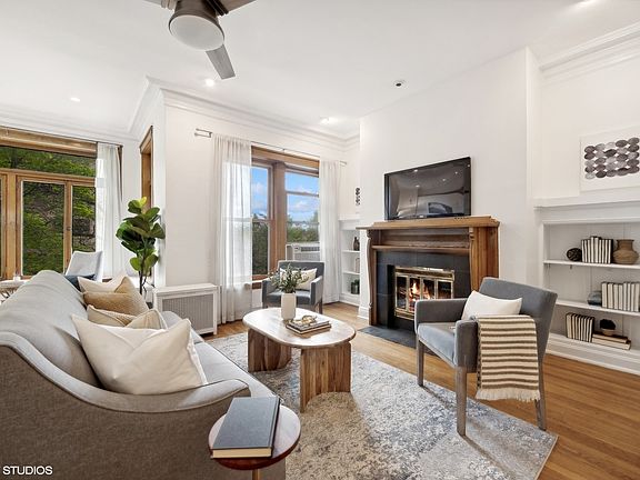 Multiple offers received. Highest and best due 10am Monday 5/6. If your dream home is a perfect mix of beautiful vintage details and modern conveniences, look no further than the penthouse unit at 649 W. Buena Avenue. This 3 bedroom, 2 full bath condo exudes elegance, craftsmanship and charm, featuring original mill-work, cove molding, brass hardware, stunning sliding wood and glass pocket doors that separate the living and dining room, and window sashes that open to let in the Lake breeze. Professionally managed and truly special, the property boasts 9.4' ceilings, over 1800 square feet of living space with a unique floor plan and flow, grand formal dining room, a wood burning fireplace, and hardwood flooring throughout. The kitchen has been thoughtfully updated with stainless steel appliances, including a Viking range (2018), newer dishwasher (2022), wine fridge, island, bar seating and modern lighting. Primary bedroom will easily accommodate a king size bed, and features a custom closet and en-suite bath that was completely remodeled in 2021 and features newly installed heated flooring. The second bedroom is also generous and includes a 5x5 custom built-out closet. Third bedroom is a perfect office or nursery. New owners will appreciate new windows (December 2020), in-unit laundry (new in 2021), freshly painted walls, one assigned exterior parking space included in the price, a back patio, and extra basement storage. Incredible location and neighborhood amenities including the underpass to the bike path across the street, Marine Drive bus at the corner, park, lake, golf course, restaurants and coffee shops right outside your front door. Welcome home!
