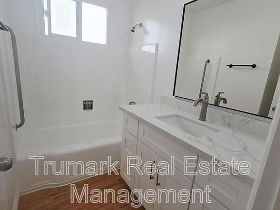Modernized bathroom with new vanity, sink, mirror, lighting, and a full-size bathtub