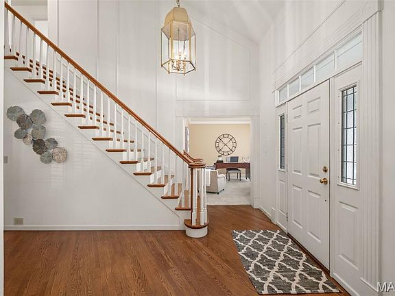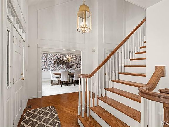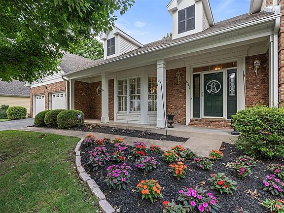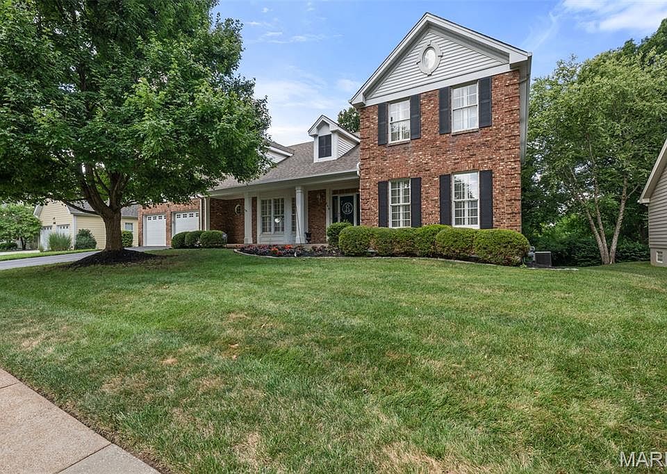 Welcome to timeless elegance in the heart of West County! This stately one-and-a-half-story brick-front colonial revival home sits on a beautifully manicured lot and offers over 3,200 sq ft of living space, with charm and character at every turn. Inside, you're greeted by a bright, welcoming two-story foyer and classic formal spaces that flow seamlessly into the heart of the home. The vaulted great room showcases stunning wood beams, a floor-to-ceiling brick fireplace, and custom built-ins including a wet bar, perfect for cozy evenings or entertaining guests. The expansive kitchen boasts rich wood cabinetry, granite countertops, double ovens, a center island, and a breakfast room with beautiful wooded backyard views. The main-level primary suite features a spacious walk-in closet, double vanity, separate tub and shower, and a bonus closet for extra storage. Additional living areas include a formal dining room with detailed millwork and a main-level office or sitting room. Upstairs, you'll find three generously sized bedrooms, including a rare second primary suite with a private bath. Step outside to enjoy the screened-in porch and deck overlooking the private, tree-lined backyard, ideal for quiet mornings or summer BBQs. This home offers a perfect blend of classic charm and modern function in a peaceful, established neighborhood.