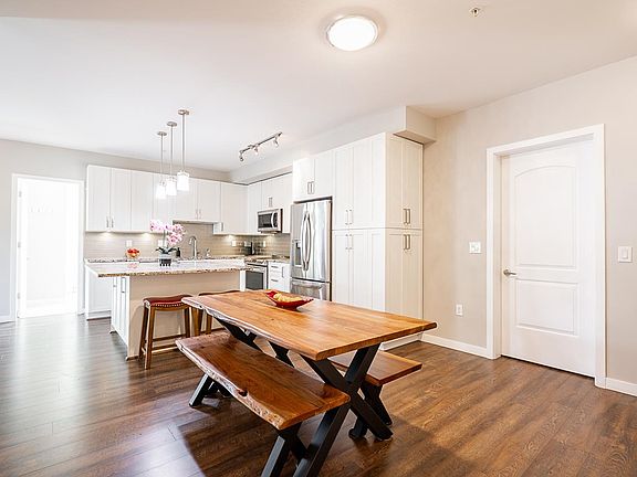 Corner unitLuxury finishesWhite shaker cabinetsHuge kitchen islandWide-plank vinyl flooringFull-sized stainless steel appliancesOn-demand hot water tap