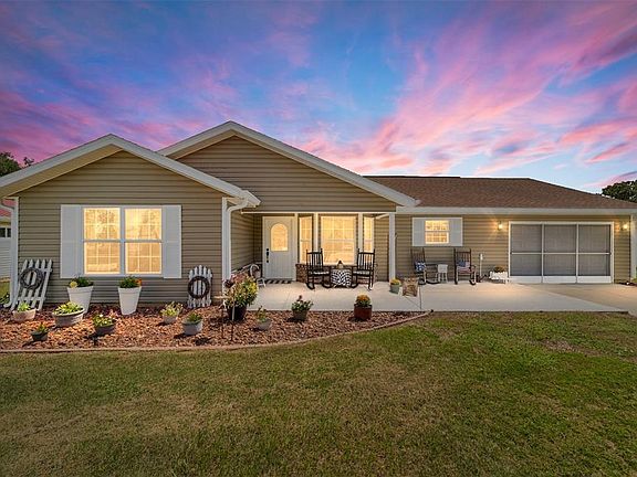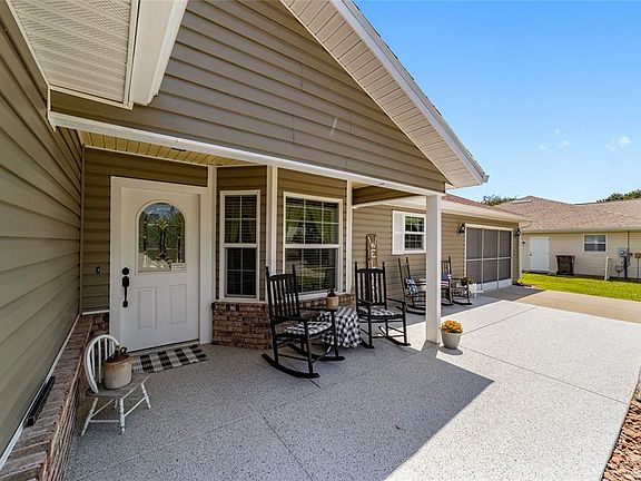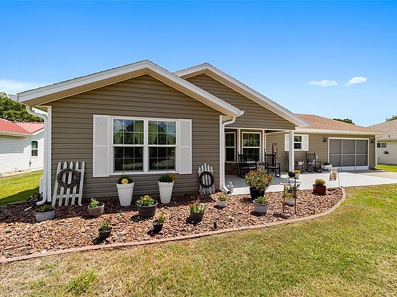 This stunning home is located in the active adult community of Marion Landing. As you pull up to this spacious home you will immediately notice the welcoming front porch inviting you to sit and relax or to enjoy your morning coffee. Upon entering you will appreciate how well this home has been lovingly maintained. The kitchen, immediately to your right boasts oak cabinets, Corian counter tops and Maytag stainless steel appliances. The living area, which is open to the dining area, is open and airy and the skylight provides a beautiful ambiance. The spacious Florida room is just off of the living/dining area, and provides extra living space. You will have no problem finding extra room when your friends and family come to visit. There is also a large lanai which is perfect for entertaining or relaxing. A large room which can be used as a hobby room, den or office and two spacious bedrooms complete this beautiful home. The primary bedroom has a walk-in closet and an en-suite. Attached to the home is the oversized one car garage with plenty of room for your car and a workshop. A large list of updates make this all the more reason to move into this well maintained home, including, new roof 2021, HVAC 2019, water heater 2025 and Pella windows in 2020. An irrigation well allows you to keep your lawn looking beautiful! Marion Landing boasts a low HOA which covers water, sewer and trash, as well as access to all the amenities. The clubhouse features a large ballroom, kitchen and library. There is an outdoor pool, shuffleboard, pickleball, tennis and basketball. A fitness center, billiards and an 8-lane bowling alley add to the reasons to make Marion Landing your home. Call and make an appointment to see this spectacular home today!
