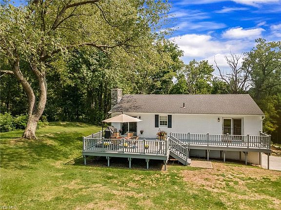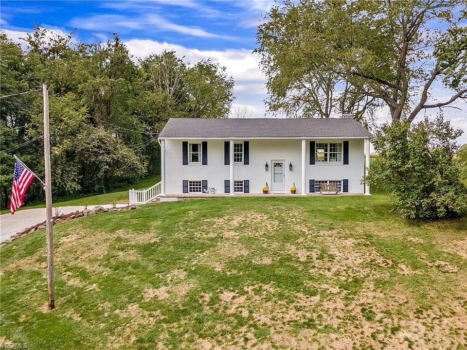 All about the View...This private setting brick raised ranch is waiting for new owner. The covered front porch runs the length of the home and opens to inviting foyer upon entering. On the main level is spacious living room, dining room with newer carpet. New patio door leads to a large newly painted deck overlooking incredible views from morning sunrise to evening sunset. The main level also has 3 bedrooms and full bath which include owners bedroom with new patio door also overlooking views. The lower level has a family room with wood burning fireplace/cedar mantle, 1/2 bath and laundry room. A two car garage with heated utility room. Lots of ++++ must see to appreciate. Seller offering one year home warranty.