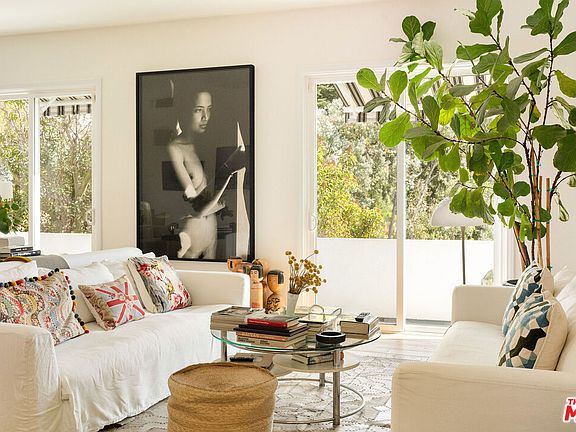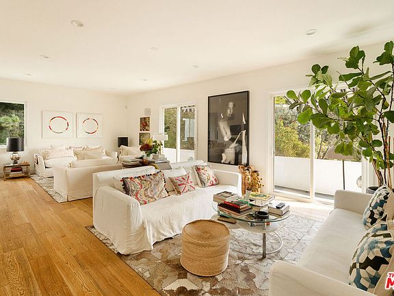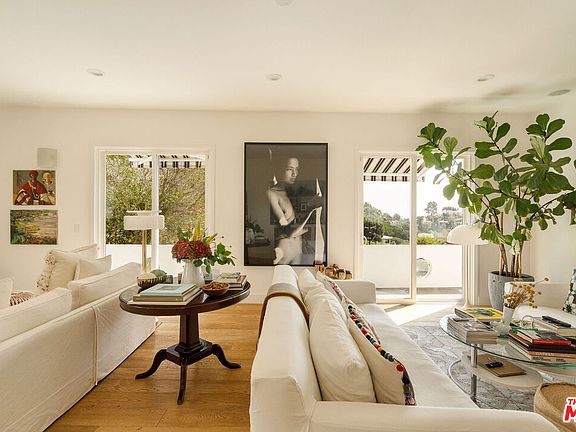 Beautifully renovated Beachwood Canyon contemporary masterpiece! Perched above the Hollywood Reservoir, this house is an art lover's dream come true, drenched in natural light with soaring ceilings, hardwood floors, gallery-style walls, and designer light fixtures throughout. The main floor is where the entertaining magic happens, with a huge living room that opens to a wrap-around porch, built-in bar, dining room that opens to the backyard with patio and heated pool, and a gorgeous chef's kitchen with top-of-the line appliances, marble countertops, black Zelig tiled backsplash, Farrow and Ball painted cabinets, and a lovely built-in seating area. The main floor also offers a powder room and two en-suite bedrooms. Upstairs, a practical and stylish library/office leads to the jaw-dropping primary suite, which features dual closets, an incredible bathroom with dual sinks, soaking tub, and steam shower, and a second wrap-around porch offering sweeping views of the hills and Downtown LA skyline. The outdoor space not only includes the pool and multiple patios, there is also a Provence-inspired garden with charming pathways dotted with citrus trees and herbs. So much to love inside and out and a great location close to Beachwood Village and scenic hiking trails, this home offers the dream Beachwood Canyon lifestyle.