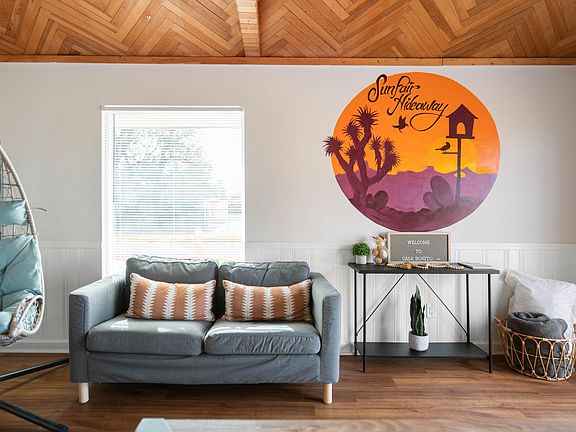 Turnkey and sold FULLY FURNISHED. This Successful Airbnb Rental w/ top rankings is nestled on a private 8,100 sq.ft. corner lot with breathtaking mountain views. This spacious 2 bed/2 bath home invites you to experience a serene lifestyle. Step inside, and you'll find a meticulously remodeled space adorned with LVP flooring throughout. The kitchen boasts sleek quartz countertops and brand-new appliances, creating a perfect environment for culinaryadventures. Picture yourself unwinding in the jetted hot tub after a day of exploration, or entertaining guests in the expansive living room with its stunning vaultedceilings. A haven awaits in the backyard--a place to sip morning coffee, savor an evening glass of wine, or simply bask in the beauty of the desert landscape. Theoutdoor retreat features inviting hammocks and a soothing hot tub, providing an idyllic escape just 10 minutes away from downtown Joshua Tree. As the sun sets,gather around the fire pit and gaze at the stars in the clear desert night sky. For a touch of friendly competition, challenge your friends to a game of pool on thestylish pool table. Situated on a private corner lot, this turnkey oasis is not just a home; it's an opportunity to live effortlessly. Whether you're ready to move right inor explore the potential of a successful Airbnb venture, this fully furnished gem is the perfect opportunity to own a home in the heart of Joshua Tree.