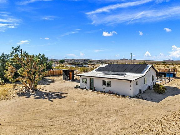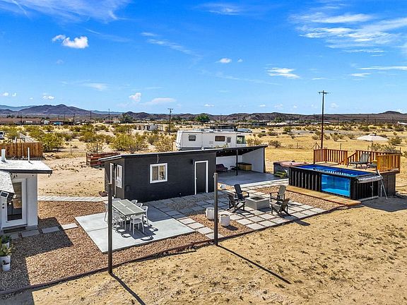 Welcome to the Horizon House! Highly rated and successful Air B and B; whether you care to carry on the tradition, or just make this special property for yourself, this mid century charmer fits the bill! 4 Bedrooms and 3 Baths situated on 1.43 acres - PAVED roads all the way! Enter Sunroom for a quiet place to read and reflect - opens to large Greatroom with Living area, remodeled kitchen with dining island, breakfast nook, farmhouse sink and updated appliances. Primary suite in main home with spa like bath. 2 additional spacious rooms (home comfortably sleeps 10). Full Bath in hall. Interior laundry area. Detached bunkhouse/casita with dedicated additional office/studio space. You are going to love the spin on the old 'outhouse' this one is impeccably remodeled including shower. Perfect for your bunkhouse guests/yurts? Tents? Outdoor covered dining area/yoga space/shade from the Desert Sun. Ultra cool shipping container pool with raised deck, hot tub for the starry nights, propane fire pit, hammock and game area. Home located only 7 minutes from Downtown, 10 minutes from main Park entrance and minutes from Joshua Tree Campground ( Music Festivals anyone?) Home is on Solar - leased with option to purchase. Views are spectacular, you don't want to miss out on viewing this charming home!