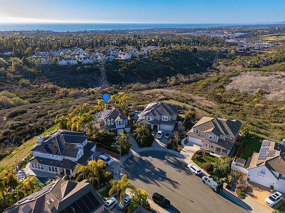 This stunning property at 6497 Wayfinders Ct. in Carlsbad CA is located in the small enclave of Surfpoint Fine Homes (same builder as Bay Collection), truly stands out with its luxurious and thoughtful design, making it an entertainer's dream and a haven for comfortable living. One of the standout highlights is the primary suite conveniently located on the first floor (two story that lives like a single story), offering easy access and privacy, complete with elegant marble counters in the primary bath for that spa-like feel. The heart of the home is an open kitchen and family room, boasting high-end Thermador appliances, marble counters, and a custom-built kitchen banquette that's perfect for casual meals or gatherings. Adding to the sophistication are Hunter Douglas PowerView shades for effortless light control. The backyard is a true tropical oasis, transformed with more than 50 palm trees that create a lush, resort-style escape. It features a thermal panel-heated Pentair-controlled pool and spa, custom lighting, a built-in bar with a new Lion built-in grill for seamless outdoor cooking, and a putting green for fun leisure activities. The custom-built palapa provides shaded seating, and the crescent-shaped layout ensures ultimate privacy while framing breathtaking ocean views through protected open space. Imagine hosting evenings here with front-row seats to the Legoland fireworks shows—it's designed for unforgettable backyard entertaining. Inside, practicality meets luxury with a private office equipped with a temperature- and humidity-controlled custom wine refrigerator that can store up to 522 bottles and 36 magnums, ideal for any wine enthusiast. Sustainability is key too, with fully owned solar panels to keep energy costs low and efficient, plus a Tesla EV wall charger for convenient plug-and-go charging. Situated in a double cul-de-sac within a small, exclusive enclave of just 21 homes, the property offers a serene, private feel without sacrificing modern conveniences.