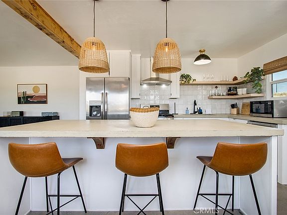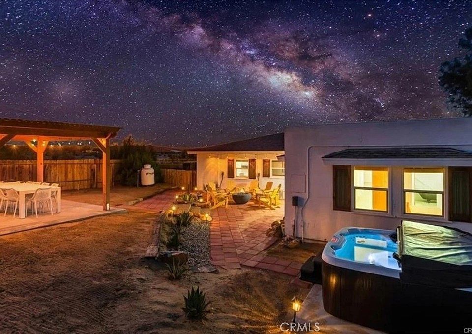 Turn-key desert retreat with income potential. Updated 4-bed, 2-bath, 1,806 sqft home on a 0.55-acre fenced lot with wide mountain + desert views. Stylish interior with polished concrete floors, ductless mini-split system, and a designer kitchen with concrete counters and full tile backsplash. Outdoor living shines with a hot tub, propane fire-pit, BBQ zone, covered patio, and space for hammocks + stargazing. Detached 2-car garage/studio already wired with electric and plumbing, ideal for a future ADU or guest suite to boost STR revenue. Quiet setting yet minutes to Joshua Tree National Park, shops, and dining. Turn-key, low-maintenance, and STR-friendly, perfect for investors or a personal desert escape.