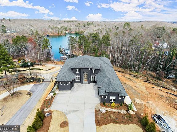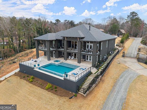 Welcome to 6498 Wildwood Trail, an architectural triumph on the shores of Lake Lanier. This better-than-new 8,500-square-foot estate is a testament to refined luxury, where flawless craftsmanship and state-of-the-art amenities converge to create an unparalleled waterfront retreat. Designed for those who demand the finest, this residence offers breathtaking lake views, resort-style outdoor living, and an ambiance of effortless sophistication. From the moment you step inside, soaring ceilings, oversized doors, and walls of glass frame the serene beauty of the Lanier. Every element has been curated to perfection-from designer lighting and elegant cove molding to the central vacuum system ensuring effortless upkeep. The primary suite is a sanctuary of its own, boasting floor-to-ceiling lake views, a private balcony, and dual custom closets. The spa-inspired ensuite is adorned in Carrara marble, featuring a freestanding soaking tub, oversized shower, and dual vanities-a retreat of pure indulgence. Designed for both grand-scale entertaining and intimate gatherings, the open-concept living spaces exude sophistication. The great room's wood-inlaid coffered ceiling and modern stone fireplace set the tone, seamlessly flowing into the chef's kitchen-a culinary masterpiece equipped with Wolf and SubZero appliances, hidden pantry, and sleek quartz countertops. The moody office with custom wall treatment offers a stylish yet functional academic retreat, while the oversized dining room is primed for elegant dinner parties and holiday celebrations. The fully finished terrace level is an entertainer's dream, featuring a private wine cellar, a cinematic media room, and a sleek kitchenette-style bar. A warm, expansive living area with fireplace and open dining space allows for seamless indoor-outdoor flow-bringing Lake Lanier's tranquility into the home. This estate is secured with a state-of-the-art security system, while a whole-home sound system delivers immersive, high-fidelity audio throughout. Step outside to a private waterfront paradise. The infinity-edge PebbleTec heated saltwater pool with tanning ledge and spa create a true resort ambiance, while the outdoor gas firepit offers the perfect spot for starlit evenings. A low Corps line and paved road ensures direct access to the water, leading to a private peninsula and sandy beach. The 32x32 dock, currently a single slip, is outfitted with a HydroLift and a party deck with a custom canopy, setting the stage for days spent boating, entertaining, and reveling in the beauty of Lake Lanier year round. With a three-car garage and meticulously designed living spaces, this estate isn't just a home-it's a destination. Located in ever-growing Flowery Branch, just a short drive from Atlanta's luxury dining, shopping, and entertainment, this residence offers the perfect balance of lakefront serenity and city convenience. Welcome home to the pinnacle of Lake Lanier luxury.