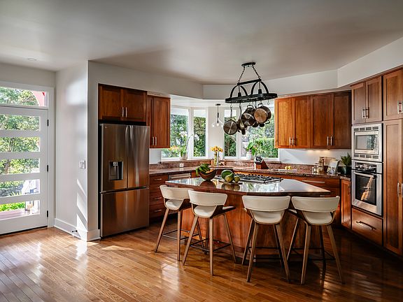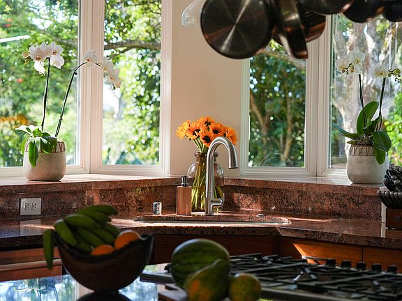 The kitchen is the heart of this home, intended for sharing time with others. Its open-flame Bosch cooktop lives in the center of the kitchen, adjacent to bar-style seating. Over the sink, you’ll find an enchanting window garden space for herbs and flowers, with an occasional view of Mauna Kea's peak. A custom handcrafted mini-bar and hotel-style custom closets add to the home’s fresh appeal. Lush, mature landscaping surrounds the home with vibrant white and purple agapanthus, iris, tropical succulents, fruit trees, and native plantings that complement the property’s natural beauty and privacy.