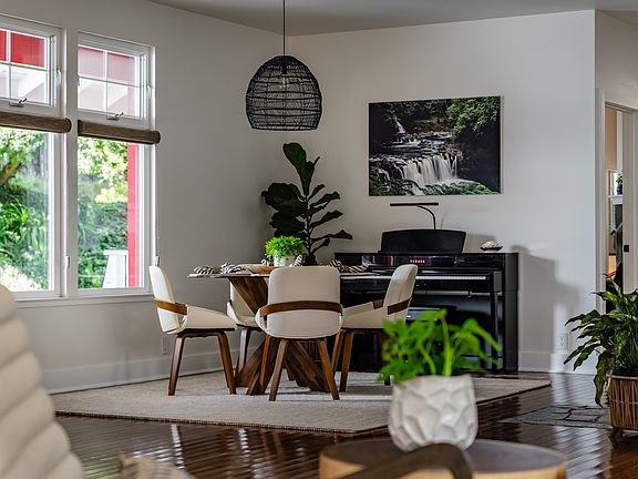 Set in the most sought-after upcountry neighborhood in the heart of Waimea, this recently remodeled, three-bedroom home captures the essence of classic Hawaiian plantation architecture with modern luxury. The rich, red board & batten exterior with crisp white trim and arched entryway creates a WOW first impression, while the two lanais invite you to relax, take in the cool mountain air, and the sounds of birds like the Kalij Pheasant, which are unique to Nob Hill.