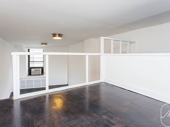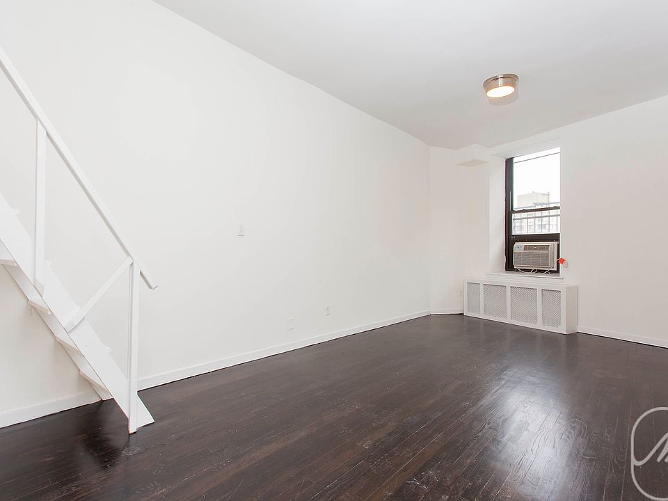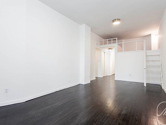 Gut renovated large one bedroom with a storage loft above living room has high ceilings and brand new hardwood floors. The separate kitchen has stainless steel appliances, Caesarstone counter tops, gas range, microwave and a dishwasher. The bathroom has been renovated with Restoration Hardware fixtures, and there are two large closets and a walk-in closet under the loft.
