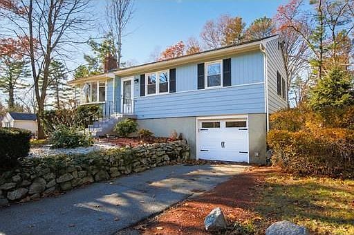 As you arrive at this meticulously maintained home you'll be welcomed by attractive curb appeal & a nicely landscaped yard surrounded by mature trees. The open & airy main level offers an open concept design which showcases a sun-splashed living room complete w/fireplace & bow window. A sweet retro kitchen offers painted cabinets + a spacious dining area w/sliding glass doors which open to a great deck which overlooks the private rear yard! Three nicely sized bedrooms + a fully tiled bathroom round out the main level. You'll love the versatility of the beautifully updated lower level as it includes a large finished play/media room + an additional bonus room, perfect for den/office/optional 3rd bedroom/guest space. Easy & convenient direct garage access makes this the perfect home! Only 1 mile to the COMMUTER RAIL train to Boston + easy access to all of the shops & restaurants nearby! Newer roof/gutters, windows, interior & ext paint +many updates to the electrical & plumbing systems!