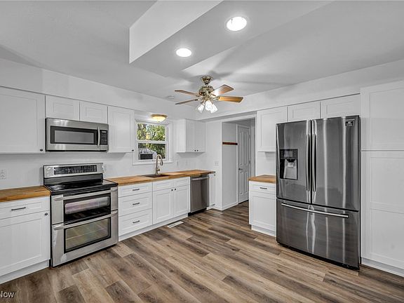 The wow factor kitchen offers butcher block counters, new fixtures, sink, and hardware—with space to add an island or custom cabinetry to make it your own. Stainless steel microwave and range included. Full pantry and half bath off the garage entrance.