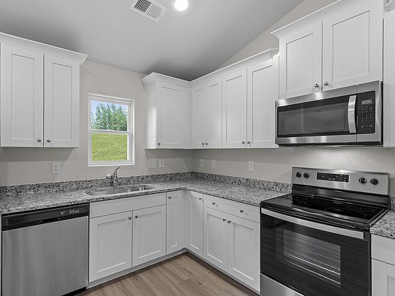 The Macon is a charming ranch home. Open Floorplan with vaulted family room and kitchen. Kitchen features granite, LVL flooring & SS appliances(including refrigerator). The primary bedroom is vaulted with walk-in closet, and granite counters. The guest bedrooms are situated away from the primary for privacy. Full guest bathroom has LVL flooring and granite counters. 2-car garage. Landscaped and sodded front yard. Conveniently located!!