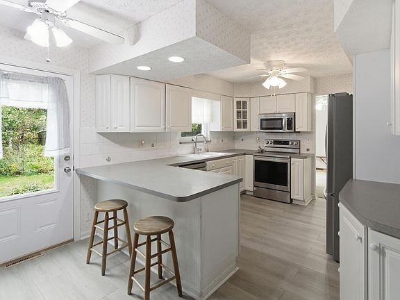Patio off the sunroomTraditional main levelEat-in peninsulaFormal livingStainless steel appliancesWhite raised-panel cabinetryRare double lot