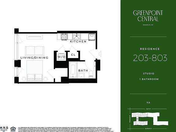 The beautifully designed studios at Greenpoint Central boast oversized windows, a sleek kitchen with custom white grain-matte cabinets, quartz polished countertops and backsplash with stainless steel appliances. Elegant bathrooms offer a natural vanity with matte black hardware, a Yukon Blanco stone vanity top, and stylish matte black sconce lighting. All your modern day conveniences are included such as a washer and dryer, and vented mini-splits and impressive ceiling heights.