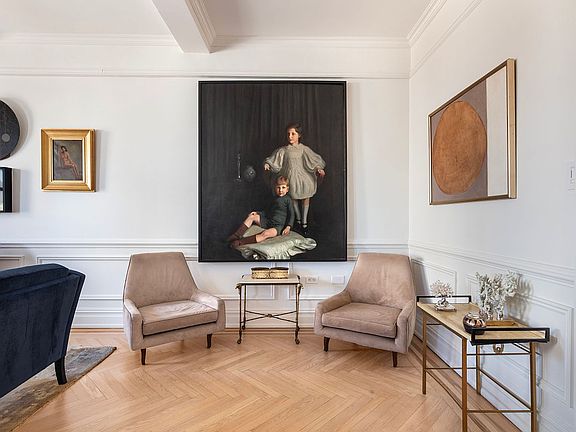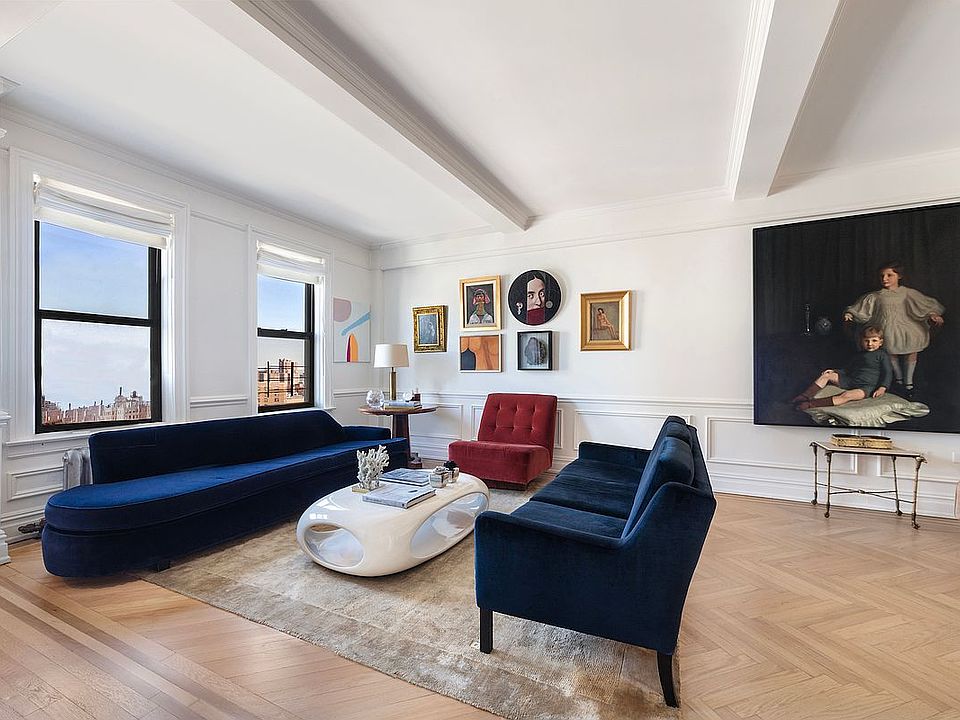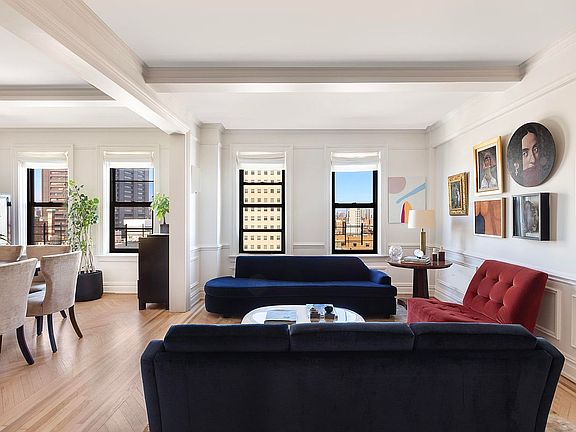 This three-bedroom, three-bathroom home offers unobstructed city views and showcases the refined architectural craftsmanship of its era — featuring 9-foot beamed ceilings, herringbone hardwood floors, and classic moldings that reflect the timeless character of Carnegie Hill.