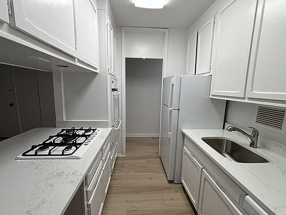 Sleek modern open kitchenGleaming hardwood floorsPrivate balconyCustom finishesWhite quartz countertopsGas cooking