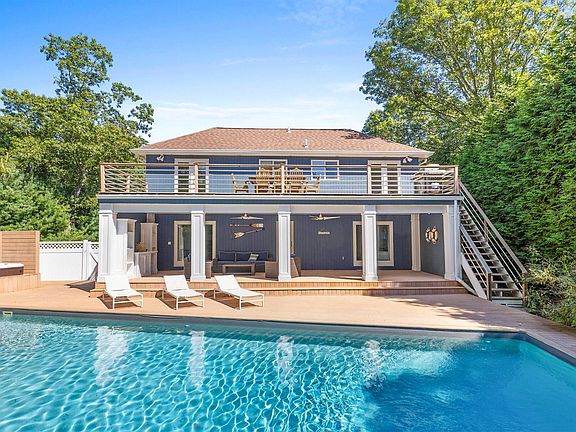 Perfectly positioned between Sag Harbor Village and East Hampton Village, this turnkey, sun-drenched retreat offers seamless indoor-outdoor living with timeless style and comfort. Set on a quiet, tree-lined street surrounded by multi-million dollar homes, the property is a hidden gem offering both privacy and proximity to the best of the Hamptons. A long, stone driveway introduces the home, framed by mature landscaping and ample parking. Designed for effortless entertaining, the residence features expansive wraparound decking, multiple outdoor dining areas, and a spacious open-air living room that overlooks a heated pool, spa, and outdoor shower-all set against a peaceful backdrop of native foliage. Inside, the open-concept main level is bathed in natural light and anchored by a generous great room with a wood-burning fireplace. The eat-in kitchen flows easily to the outdoor dining terrace, making al fresco meals a daily pleasure. The main level also hosts the primary bedroom suite, complete with a private balcony and en-suite bath. The lower level offers two beautifully appointed guest bedrooms, each with direct access to the pool and outdoor living spaces-perfect for accommodating guests while maintaining privacy. Additional amenities include central air, hardwood flooring, and low-maintenance grounds ideal for seasonal or year-round use. The home is surrounded by scenic trails and is mere minutes from serene bay beaches, offering the perfect blend of active living and laid-back luxury. Whether you're seeking a full-time residence or a weekend escape, this impeccably renovated home delivers the best of the Hamptons lifestyle in a tranquil, investment-worthy setting.