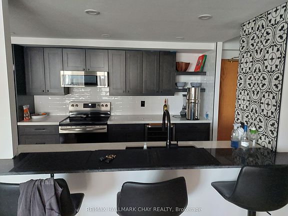 Welcome to Marina Bay. Don't miss out on this modern fully renovated 1,155 sq ft suite with spectacular waterfront views of Kempenfelt Bay, park, and waterfront paths. Spacious open concept 2 bedroom, 2 bath, a perfect layout for entertaining. Large living/dining room combination, open kitchen and loads of cabinets provides ample storage. Top end finishes and upgrades throughout, includes custom trim and door package, flooring throughout, quartz counters, custom cabinets, stainless appliances, wine fridge, pot lights plus more. Gorgeous tile work, stainless appliances, upgraded vanities and finishes make this a perfect place to call home. Includes in-suite laundry, locker and underground parking. Building amenities include exercise facilities, hot tub, sauna, indoor pool, party room and an optional guest suite available for extended family stays. Walk the extensive waterfront paths, enjoy Centennial beach, marinas, restaurants, entertainment, shopping and steps to the newly renovated Go Station, 3 minute drive to Hwy 400.