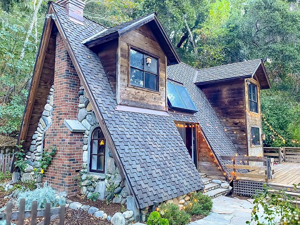 Tucked into 2.5 hillside acres next to Garland Park's Kahn Ranch, this fairytale 2-bedroom, 1-bathroom A-frame cottage blends rustic charm with modern comfort. A stunning stone fireplace, unique pecky cedar, and vaulted