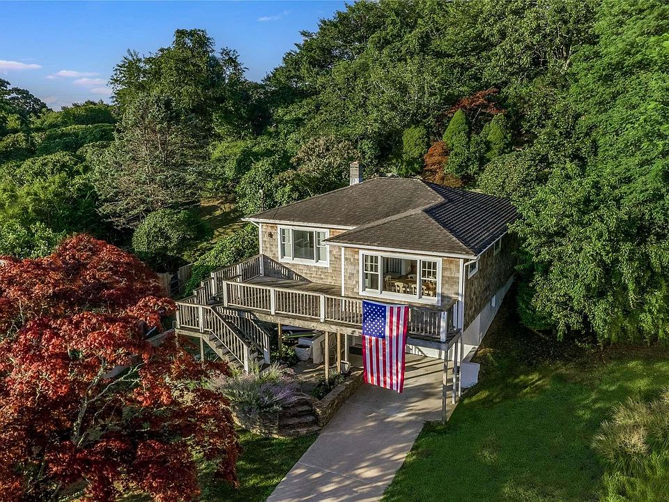 Set back and elevated, this home's unique perspective facing southeast affords views of Fort Pond to the Village skyline with glimpses of the Atlantic Ocean. Crisp and Clean with approximately 1350 sq. ft. of interior space, the main level of this home provides two bedrooms and one full bath, open concept living, dining, and kitchen, highlighted by a Brazilian Cherry countertop and all stainless appliances. Downstairs you will find the media room, the second full bath, a laundry room with a custom built-in for storage, plus a 1-car garage. Just off the kitchen the backyard is a fun surprise with lawn space to gather, and above the tiered gardens, discover the secret patio. This elevation is higher than the house, and the views are even more impressive. Totally private, it's the perfect spot to ponder, meditate, or just relax and embrace Montauk. A sweet east end retreat, year-round or as a vacation home, this ideal location puts you just across the pond with sidewalks to downtown Montauk and the beach. At day's end, the best sunset spot in Montauk is also just a moment away. Pack a cooler and beach chair and experience the spectacular display over Fort Pond Bay from the beach at Navy Road. From beginning to "the end", Montauk is a special place to live, all day and every day. Owner/Broker