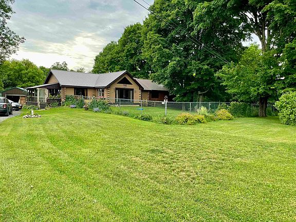 MOTIVATED SELLERS! WELCOME TO THIS CHARMING LOG CABIN! This lovely 4 bedroom, 2 bathroom log cabin featuring a front and back deck, covered porch, fenced in front yard, a detached garage, and so much more! Enter through the front sliding glass doors into the inviting dining area, which flows seamlessly into a spacious kitchen complete with ample cabinetry, generous counter space, a large island with bar seating, and stylish pendant lighting. All kitchen appliances convey with the home. A unique live-edge bar area offers additional seating and charm. The open-concept layout continues into the expansive living room, where you’ll find a tongue-and-groove cathedral ceiling with exposed beams, hardwood floors, abundant natural light, and a beautiful stone accent wall with a cozy woodstove—perfect for those chilly winter nights. The primary suite features a walk-in closet, a lovely private bathroom, and sliding glass doors leading to the back deck. Down the hall are three additional bedrooms, a full bath, and a convenient laundry room. Handmade interior doors add a distinctive rustic touch throughout. The basement offers a game room, plenty of storage space, and essential home systems including a forced-air propane furnace, on-demand hot water heater, and water softener. Enjoy outdoor living at its finest—relax on the front or back decks, both with fenced-in areas, or unwind on the covered side porch. This lovely home is close to Potsdam, Canton, Madrid, Waddington and Winthrop. Don’t miss your chance to make this beautiful log home your own—schedule your private showing today!