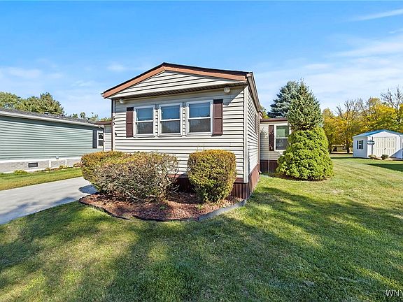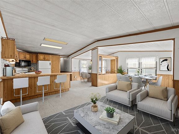Step inside this bright and inviting home featuring cathedral ceilings and an open floor plan that seamlessly connects the spacious kitchen to the living room—perfect for comfortable everyday living or entertaining. The primary suite offers a private retreat with a soaking tub in the full bath, while the second bedroom features built-in shelving and its own private bathroom, ideal for guests or a home office. Enjoy the added convenience of an attached 1-car garage, concrete driveway, storage shed, and a concrete patio behind the garage—a great spot for outdoor relaxation. This move-in ready home blends space, function, and style in every detail. Sq ft is 993