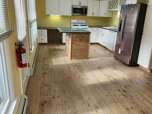 SINGLE FAMILY HOUSE - not an apartment!. Live on this double wide lot on a quiet street. Large grass yard and patio deck with grilling area. Central Air conditioning, two zone baseboard heat. New flooring throughout and recently up-graded interior two years ago. Large sunny kitchen area with sky light and recessed lighting. Kitchen island with storage and eat at counter and a large eat-in area for table and 6 chairs. New refrigerator and microwave with outside ventilation. First Floor: full bath, laundry area including washer and dryer, mud room, kitchen, dining and living rooms and two bedrooms. Second Floor: two bedrooms and full bathroom. Two rear entrances: one into kitchen, the other into the mud room with ADA access. Clean basement for storage as well as an outdoor shed for seasonal items. Well maintained property with lots of perennials that are colorful from spring through fall. Pets are negotiable.
