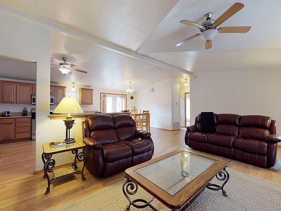Drive up to this home and the one acre lot will amaze you. It is private, away from the main highway, with plenty of space for toys, and plenty of space to play. Stroll to the top of the porch and enjoy the views of the mountains and the beautiful colors of the the river foliage and our enchanted sky. Step into this open concept, great room, and see the living room, dining area, family room and kitchen. The kitchen has corian counter tops and the appliances are all stainless steel. To the right are two bedrooms and a full bath. To the left is the first master suite with a good size closet and a nice size private bath. The laundry room is spacious, too. An incredible surprise, is an enormous media room/recreation room , whatever you would like it to be, is attached to another master suite