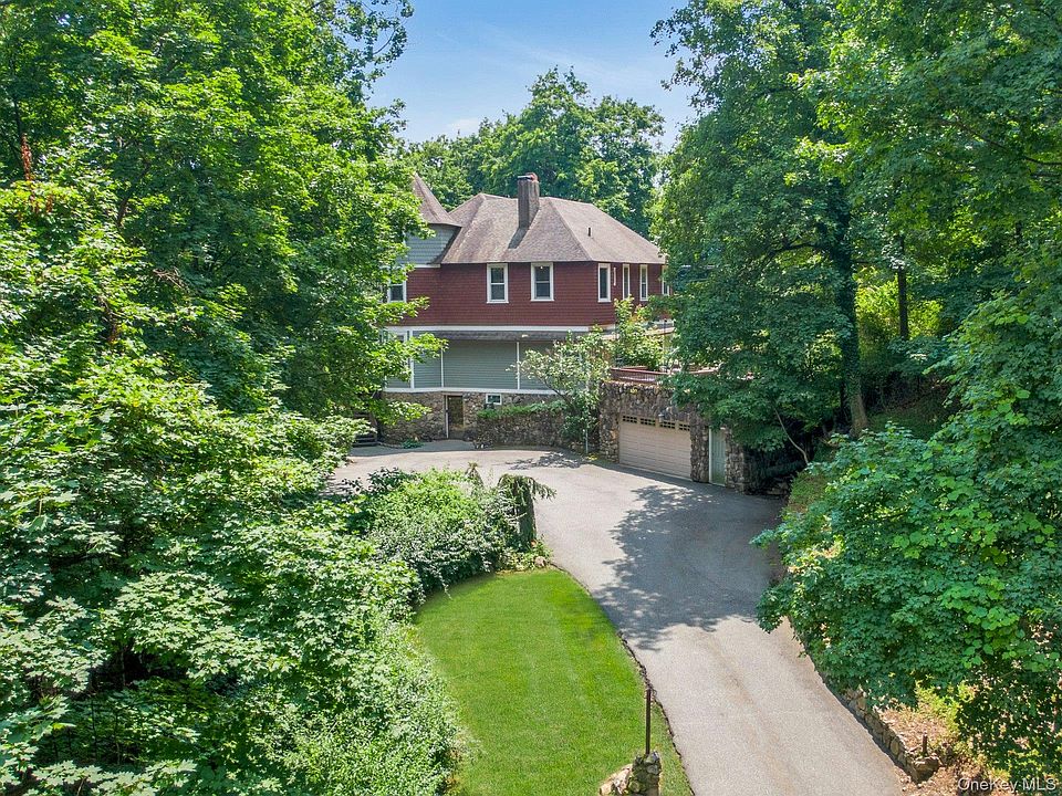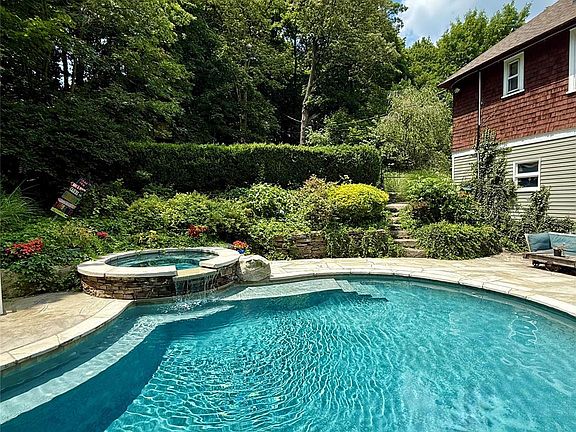 The outdoor space offers the luxury of an inground saltwater heated pool with spa and waterfall, multiple outdoor terraces, a level lawn, and the impressive and unspoiled surroundings of nature. The patio and rooftop deck on the western side of the home offer picturesque mountain views of sunsets and starry skies amid the curated gardens. Strategically positioned atop the hill of Rockledge Gardens, the house sits on a dead-end private 1.75-acre lot with no through traffic, offering sublime privacy and a wondrous, peaceful setting abutting Harriman State Park.