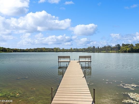 Set on more than five acres of beautifully landscaped grounds with 400 feet of private shoreline, this French Country estate captures the essence of refined lakefront living on Barrington Hills' exclusive Hawley Lake. Commanding its rare position with timeless elegance and resort-style amenities, it offers a lifestyle of unparalleled beauty, inspiration, privacy, and sophistication. A seamless blend of comfort and refinement, the property is both a private sanctuary and a resort-like retreat, designed for living beautifully indoors and out. From the moment you arrive, the setting captivates-rolling lawns, towering trees, an apple orchard, and a flourishing garden surround a stately brick residence with sweeping lake views. The estate's amenities rival those of a private resort: a large salt-water pool and separate spa framed in stone, a fully equipped outdoor kitchen and bar for lively gatherings, and generous terraces and porches that invite relaxation at every turn. Inside, timeless craftsmanship and thoughtful design take center stage. Soaring windows flood the interiors with light, while custom millwork and architectural detailing provide an air of refinement. The formal living room is inviting and grand, and the two-story great room with box beam ceiling both have fireplaces and are elegant backdrops for entertaining. The chef's kitchen, with adjoining hearth room and dining area, is as inviting as it is functional, with sweeping views of the lake and grounds - and a generous space to both create and entertain. The brightly lit main-floor primary suite offers a private deck overlooking the lake, large bathroom and two walk in closets. The richly appointed library opens to the separate porch and a spacious wet bar -your own secluded retreat. A large screened porch provides views of the grounds, and a place to enjoy nature in a protected area - from Spring through Fall. An inspiring atrium staircase ascends to the second floor, where two ensuite bedrooms anchor one wing, complemented by two additional bedrooms, a full bath, a versatile loft, and a spacious unfinished attic ready for customization. The walkout lower level expands the living experience with a light-filled family room, game room, wet bar (convertible to a second kitchen), gym with heated cork flooring and pool/playroom-all flowing effortlessly to the estate's spectacular outdoor spaces. Thoughtfully designed for in-law and au pair living, there are two staircases to both the second floor accommodations and the walk out lower level. Nestled at the end of a quiet cul-de-sac, the property opens directly to spring-fed Hawley Lake, known for fishing, paddleboarding, pontoon boating, and endless wildlife sightings. Your private pier and sandy beach invite morning swims, sunset cocktails, and memories made across the seasons. Two outbuildings enrich the lifestyle-an authentic livestock-ready two-stall barn, with separate luxe chicken quarters, and a charming historic original home, brimming with potential as a pool house, art studio, or private office. Luxuries abound as well: a three-car attached garage, circular driveway, and proximity to Barrington's charming village, world-class dining, award-winning schools, boutique shopping and convenient access to O'Hare, downtown Chicago and the Metra train. This is more than a home-it is a lifestyle of rare privacy, natural waterfront beauty, and timeless elegance. A once-in-a-lifetime offering, it is destined to become the next steward's enduring legacy in the heart of Barrington Hills.