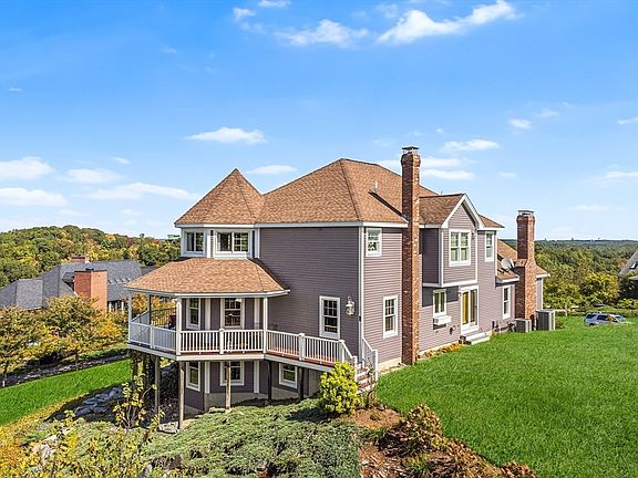 Perched atop a scenic hill and set on 2 acres, this residence offers breathtaking 360-degree views of rolling hills, farmland, and distant mountains. Designed with timeless craftsmanship and maintained with care, the home blends elegance and modern comfort across three levels. A wraparound deck provides the perfect vantage point to enjoy the natural surroundings. The heart of the home features an open layout between the sun-filled family room and kitchen, with oversized windows framing the views and a fireplace adding warmth. The kitchen includes a bright breakfast nook, abundant cabinetry, and a large walk-in pantry, while the formal dining room with French doors allows effortless indoor-outdoor living. The private office and second living room add versatility. Upstairs, the primary suite offers a spa-like bath and walk-in closet, joined by three additional bedrooms and a laundry room. The finished lower level, with high ceilings and full-size windows, offers additional living space.