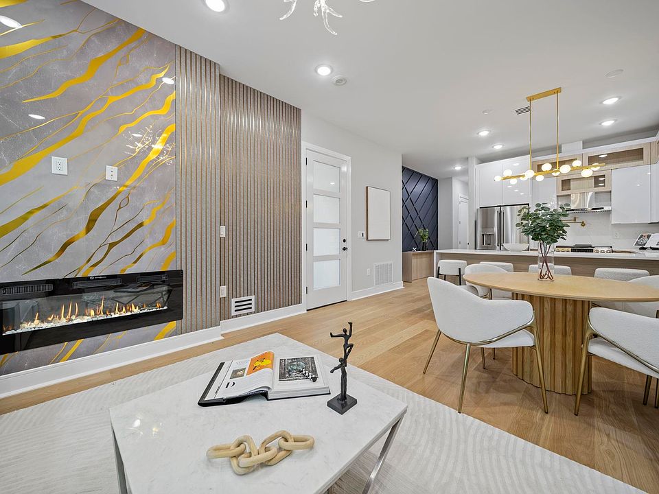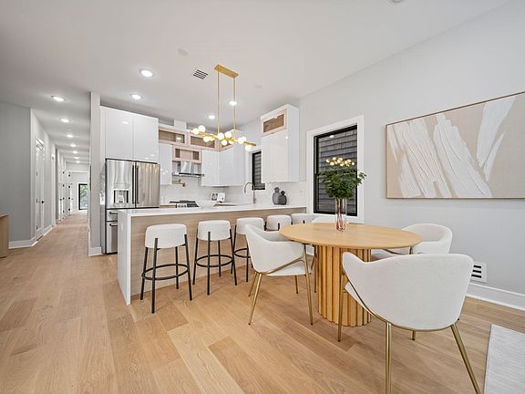This unit features 4 bedrooms, 3 full baths and private backyard. Living room is flooded with natural light from the oversized Anderson windows, featuring peaceful views of the tree lined street. In addition your Living Room offers white oak hardwood floors, 10 ft ceilings and built in speakers. Sleek kitchen is designed with top of the line stainless steel GE Cafe appliances, quartz waterfall counters and backsplash, oversized stainless steel sink, two-tone custom cabinetry, pot filler, stylish gold hardware and fixtures, and high-end pendant lighting. Living room features a fireplace framed with custom accent wall and mantle. Main bedroom suite offers ample natural light with oversized windows and sliding glass door which leads to your private glass railing balcony. This bedroom suite boasts custom millwork accent wall with dual pendant lighting and the option for a full custom closet build out. Your OVERSIZED main bathroom suite offers an oversized double vanity, floor-to-ceiling large format tiles, dramatic warm accent lighting and back lit mirror, soaking tub and a top of the line waterfall shower with sprayer. Each of the additional 3 bedrooms feature high end custom built-in closets and custom millwork accent walls. 1 additional full bathroom accommodates these 3 bedrooms and are beautifully designed with book matched floor to ceiling tile, smart toilets, and top of the line bronze shower fixtures and finishes. Full size washer/dryer in unit add to the convenience of the home. Downstairs you will find an additional living space complete with an additional full bathroom that leads out to your private professionally landscaped backyard, complete with fire pit, paver patio, and custom metal wood toned fence. The home is equipped with a smart doorbell, Legrand smart dimmers, and energy-efficient smart thermostats, Security Cameras and built in speakers. Large garage with room for 2 cars. The exterior facade has been designed with modern yet timeless features and exterior lighting. Please note that square footage is approximate. Amazing location is just steps from downtown JSQ with tons of restaurants, shopping and transit options to the city. Property also comes with 10 year warranty and qualifies for 5 Year Tax Abatement.