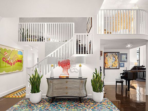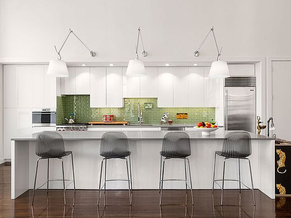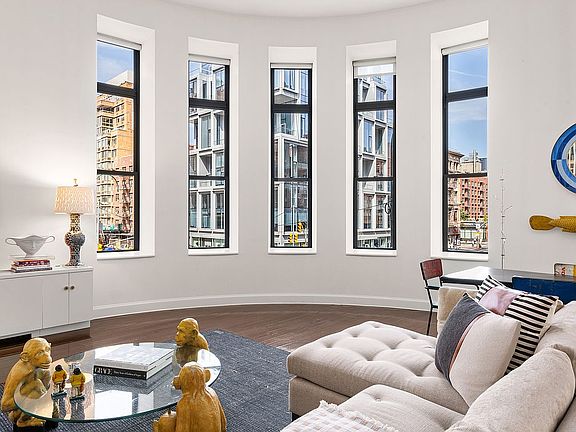 Mint condition corner 3,100+ sq foot loft with 14ft+ ceilings at The Greenwich. The mezzanine sq ft is not included in the 3,100 sq ft. A prewar condominium in the heart of Greenwich Village. This apartment features three bedrooms, three bathrooms with a washer dryer. There is an additional 500 square feet of living space in a loft area overlooking the living room, currently used as a library/media mezzanine. A spacious foyer leads to the expansive living and dining areas, providing an excellent place for entertaining. The dramatic curved wall of windows in the living room are 10ft. Adjacent to the grand living area, you’ll find a beautiful open kitchen equipped with am extra-large center island, ample seating, and top-of-the-line appliances. The primary suite has 14ft ceilings, ensuite bathroom with vanity and an expansive walk-in closet. Additionally, there are two well-proportioned guest bedrooms. There are custom closets for ample storage throughout the home.