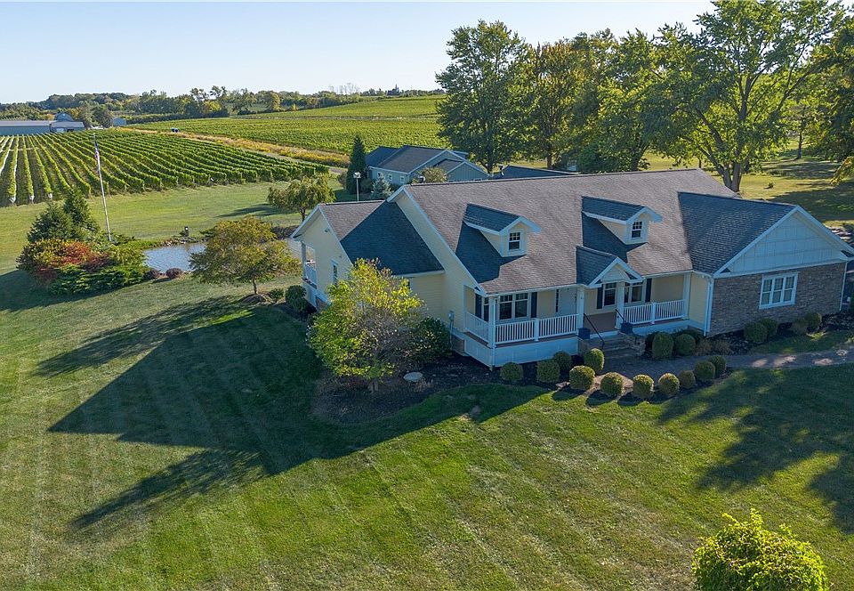 Custom Ranch with Dream Garages & Vineyard Views Geneva, NY. Exceptionally 2012-built ranch offering luxurious one-level living in the heart of the Finger Lakes! Set on 1.8 scenic acres overlooking rolling vineyards and your own private pond, this 2,740 sq ft home is designed for comfort, style, and efficiency. Inside you will find 3 spacious bedrooms, each with its own private en suite bath. Cherry hardwood floors flow throughout the open floor plan, perfectly complementing the stunning cherry kitchen with granite countertops and ample cabinetry. Stay comfortable year-round with energy-efficient geothermal heating and cooling. The full basement offers endless possibilities, while the attached 3-car garage provides convenience and storage. For the hobbyist, car collector, or entrepreneur, the 5-car detached garage is a dream come true—fully equipped with water, heat, and its own office/studio space. Just minutes from downtown Geneva, Seneca Lake, and award-winning wineries. Don’t miss this rare combination of craftsmanship, space, and location—Make offer good for 24hours.
