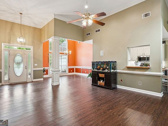 Nestled on a hilltop corner lot in an established Covington community, this recently updated 3-bedroom, 2-bath home blends comfort, privacy, and smart home convenience. Step inside to find wide-plank LVP flooring throughout (no carpet), elegant crown molding, Alexa-enabled recessed lighting, and designer fixtures. The open living area features a gas fireplace with a mounted surround sound system, while the dining room offers a large arched window and classic wainscoting-ideal for entertaining. The spacious owner's suite features a soaking tub, dual vanities, and a walk-in closet. The secondary bath boasts a spa-style shower. Enjoy the outdoors in a professionally designed backyard with a pergola-covered deck, tiled grilling station, and a butterfly garden enhanced by solar and LED lighting. The two-car garage and extended driveway add curb appeal and functionality. Located just minutes from I-20 with easy access to Atlanta