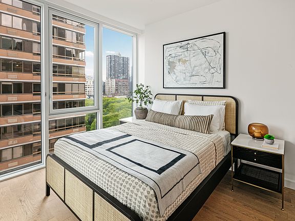 Step into a spacious two-bedroom apartment where floor-to-ceiling windows facing South-West bathe the open layout in soft, natural light, accentuating up to 13-foot ceilings and elegant stone and wood flooring. The gourmet kitchen dazzles with stainless steel appliances, including an electric cooktop and wall oven, sleek Silestone countertops, and custom cabinets illuminated by LED lighting. The spa-inspired bathroom, featuring premium Kohler fixtures, exudes tranquility. Everyday luxury shines through with an in-unit washer/dryer, individual central air conditioning, keyless entry, and energy-efficient LED lighting, perfect for a comfortable and stylish lifestyle.