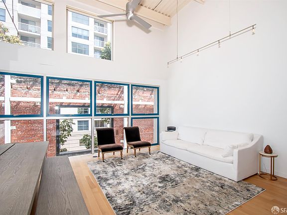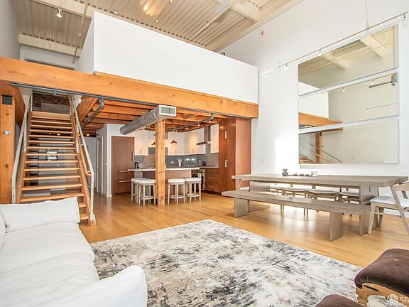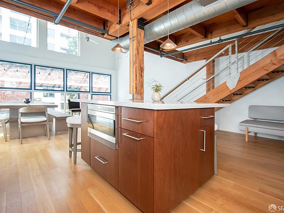 Fabulous live-work style condo at Oriental Warehouse in South Beach! Top floor and flooded with natural light, this residence boasts an open floor plan with exposed brick and timber, and southern-facing windows. The main floor features a living/dining area with 20-foot ceilings, a kitchen with stainless steel appliances, and a full bathroom. The upstairs loft features a primary bedroom and a loft bedroom that can be an office, one full bath and a custom walk-in closet. Additional amenities include hardwood floors throughout, ceiling fan, custom window coverings including motorized shades, 2 skylights, in-unit laundry, one-car deeded parking and storage locker. Secured building, high walk score, minutes to the Embarcadero waterfront, light rail, farmer's market and Oracle Park. Unit is now vacant and unfurnished.