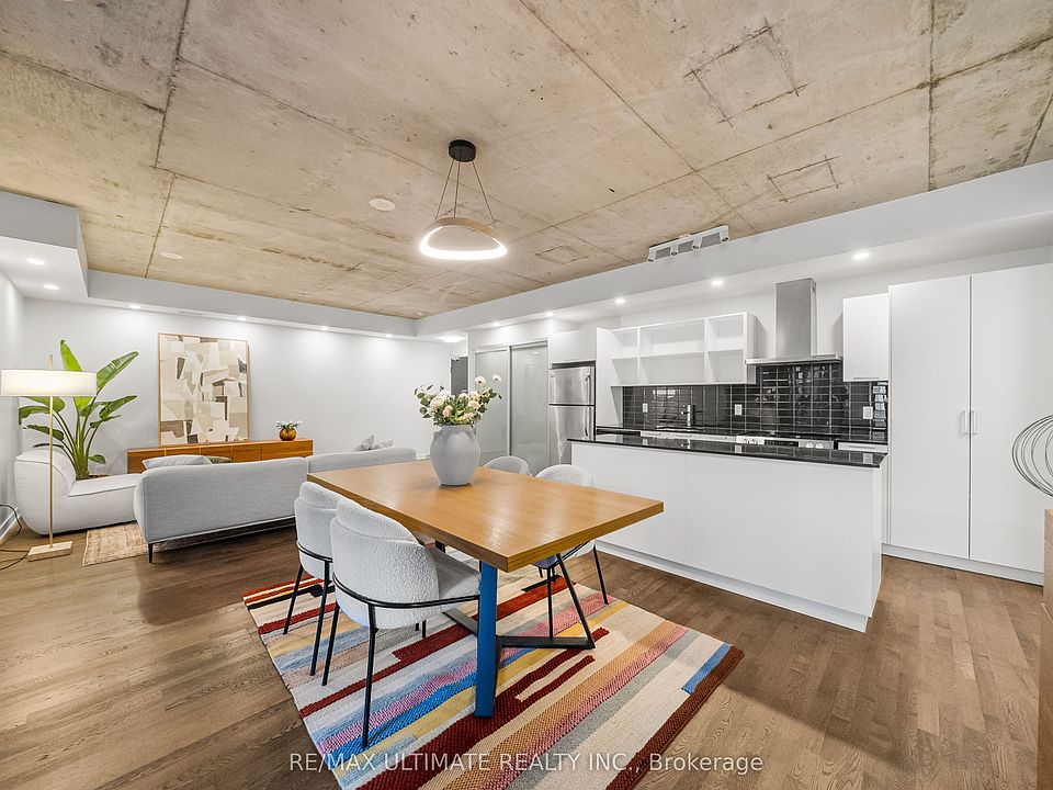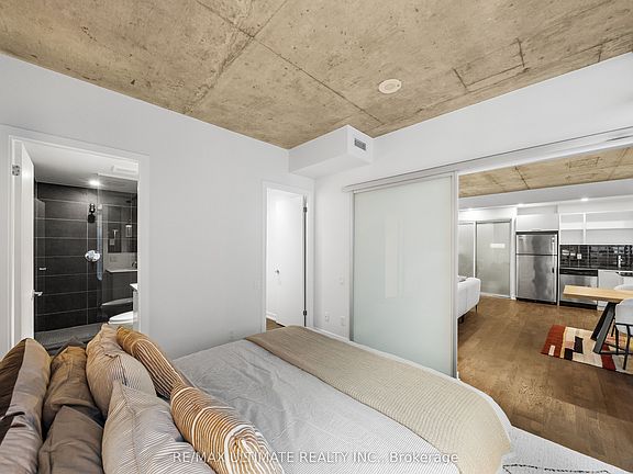 Experience boutique modern urban living in this stunning 1,086 sq ft 2 bedroom - 2 bathroom suite in the heart of King West. 991 sq ft of meticulously designed interior space and a generous 95 sq ft balcony. Designed with 9-ft exposed concrete ceilings and floor-to-ceiling windows, this home blends modern style with functional comfort. The open-concept kitchen includes an extra-wide marble-topped island, stainless steel appliances, and ample storage ideal for everyday cooking and effortless entertaining. The open-concept living and dining area extends seamlessly to a bright balcony, perfect for outdoor dining or unwinding with a view over the courtyard. The king-sized primary suite offers a peaceful retreat with a walk-in closet and a sleek glass-enclosed en-suite shower. The second bedroom provides flexibility for guests, a home office, or creative space, and is complemented by a full second bathroom. Additional highlights include in-suite laundry and generous storage throughout. This pet- friendly building offers premium amenities including a 24-hour concierge, a fully equipped gym, and an inner courtyard green space. 1 priority parking spot is included. Located steps from the King Streetcar, the upcoming Ontario Line, parks, restaurants, cafés, galleries, and shops, this is a rare opportunity to own a split layout condo in one of Toronto's most vibrant neighbourhoods.